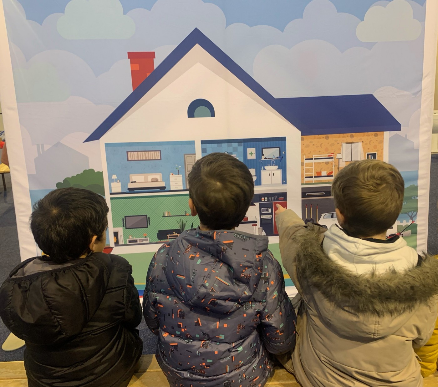 L’animateur accueille les enfants devant un décor pédagogique représentant la maison.