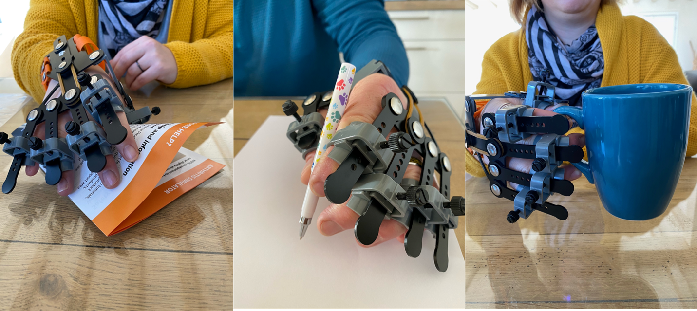 Le kit comprend 1 sacoche avec un exosquelette pour chaque main (droite et gauche) qui simule l’arthrose modérée à sévère.